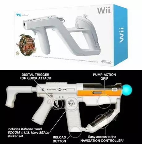 Wii和PS3的做法比较偷懒,直接在体感外设之外加装了枪托。对应Wii手柄的“Wii Zapper”和与PS Move搭配的“Sharp Shooter”都是这个时代产物。