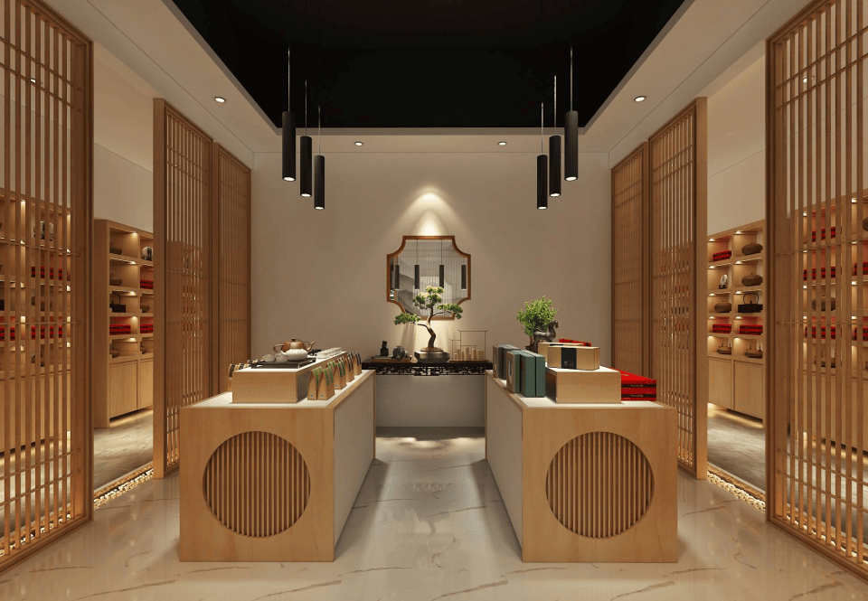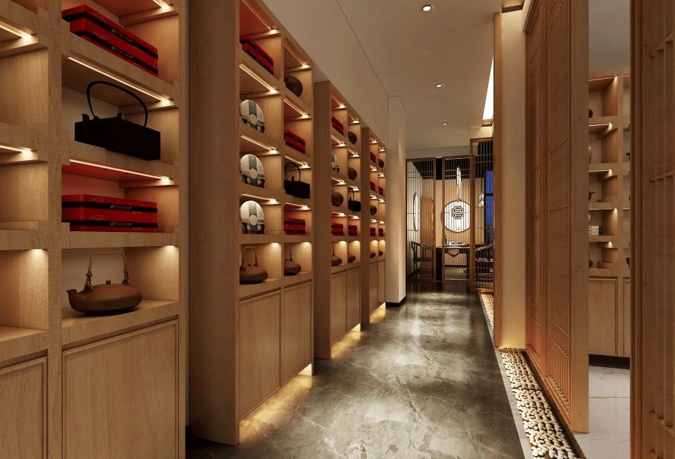 1. 入口与接待:设玄关/屏风,弱化外界喧嚣;配置茶品展示柜、收银台;预留等候区小茶座。