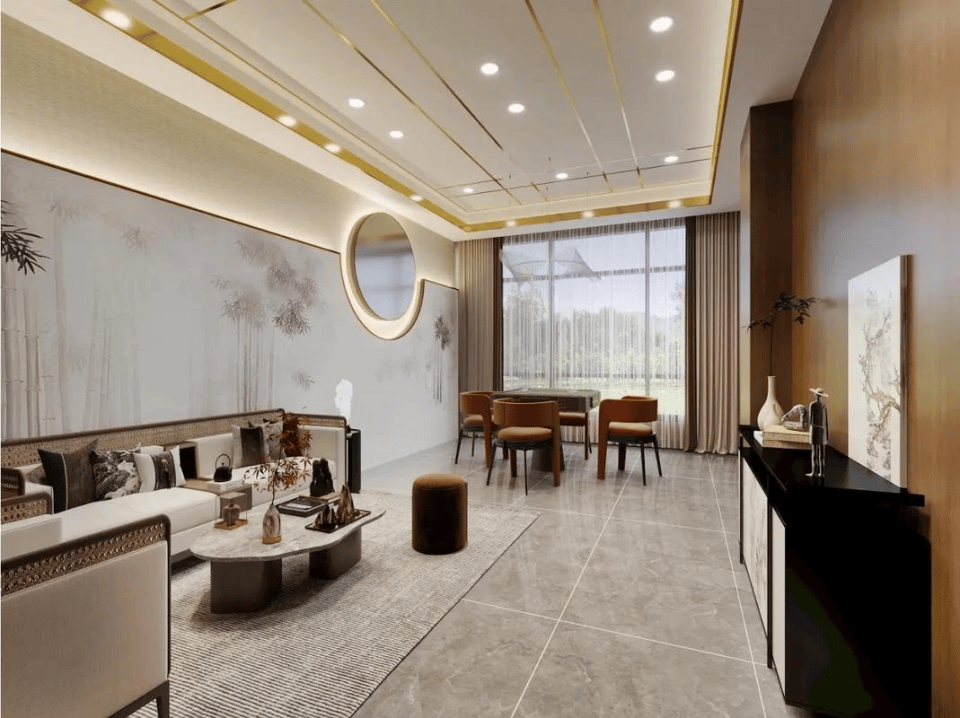 2. 新中式(当下主流):简化传统线条,融合胡桃木、岩板、长虹玻璃等现代材质,配色以米白、浅灰、原木色为基底,点缀墨绿、赭石;兼顾雅致与舒适,适配年轻客群与商务场景。
