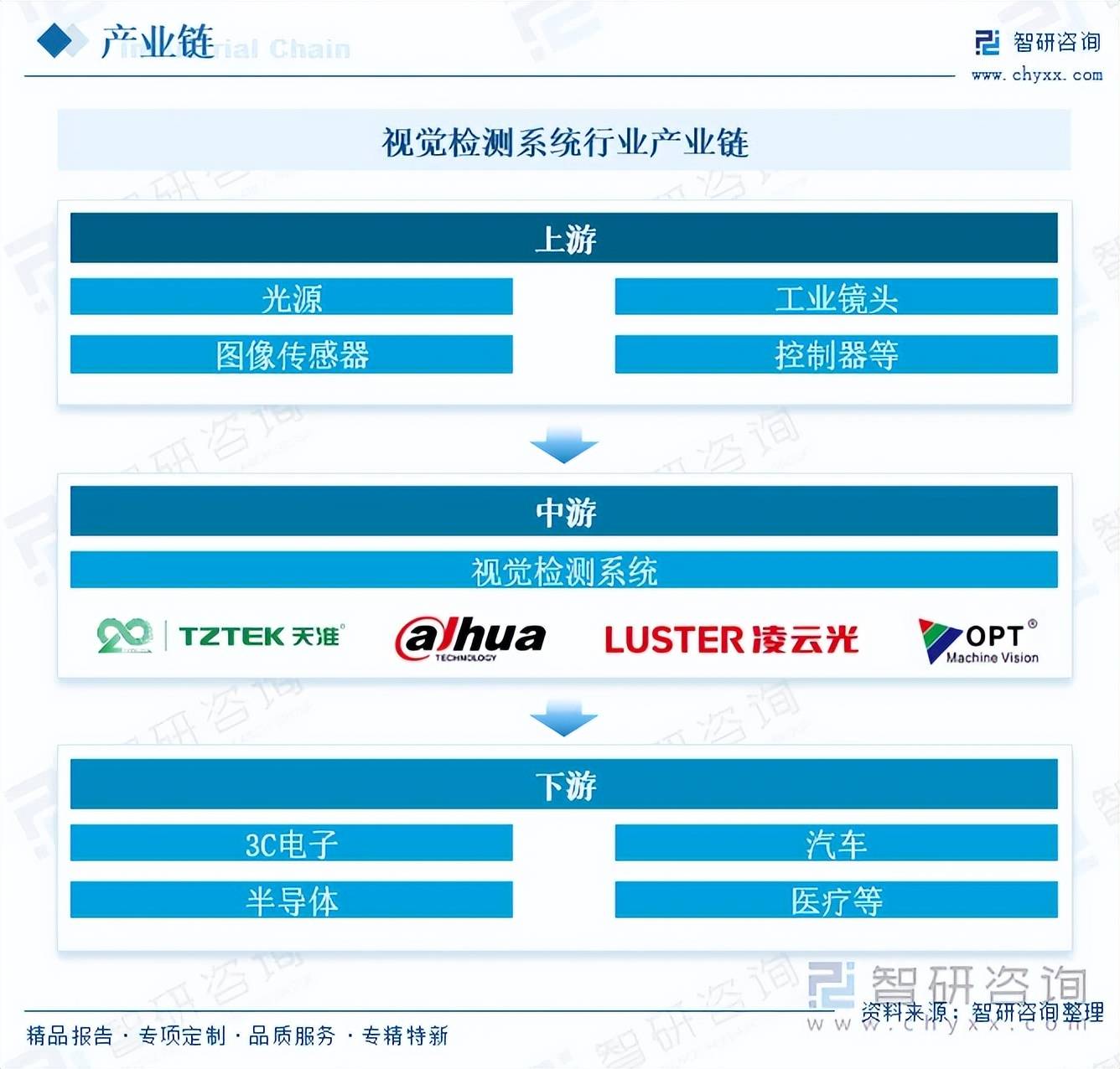 视觉检测系统行业产业链上游主要包括光源、工业镜头、工业相机、图像传感器、图像采集卡、控制器、图像处理算法库、AI平台、深度学习框架等基础硬件和软件。产业链中游为视觉检测系统整机制造与系统集成环节。产业链下游主要应用于3C电子、汽车、半导体、医疗、食品、包装印刷等行业,以提高生产效率和产品质量。